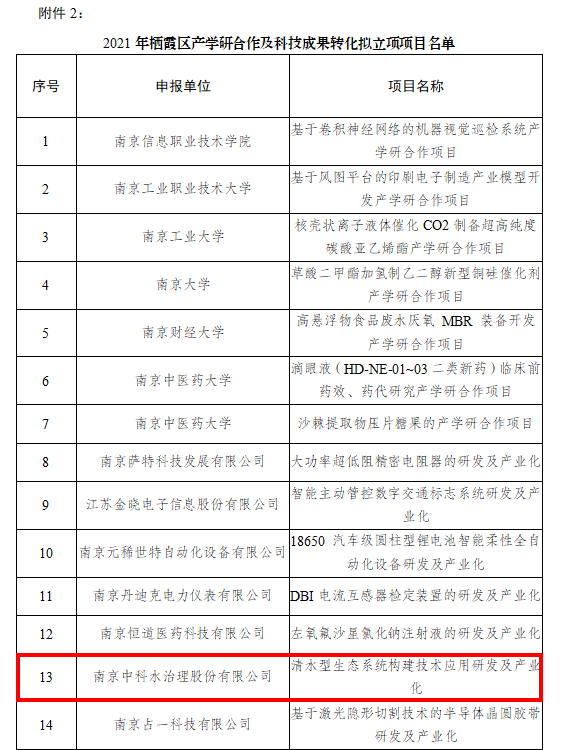 近日,我司科研項目《清水型生態系統構建技術應用研發及產業化》成功申報2021年棲霞區科技成果轉化項目。這是公司在科研方面的持續投入及創新能力的不斷提升,也是對公司研發實力的肯定。