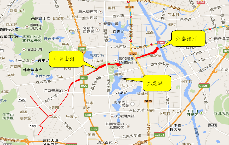 牛首山河自司家橋至石家垾而匯入秦淮河,河全長8.8km,流域面積46.4km2,作為防洪排澇河道,控制河底高程4-5.5m,河底寬5-20m。