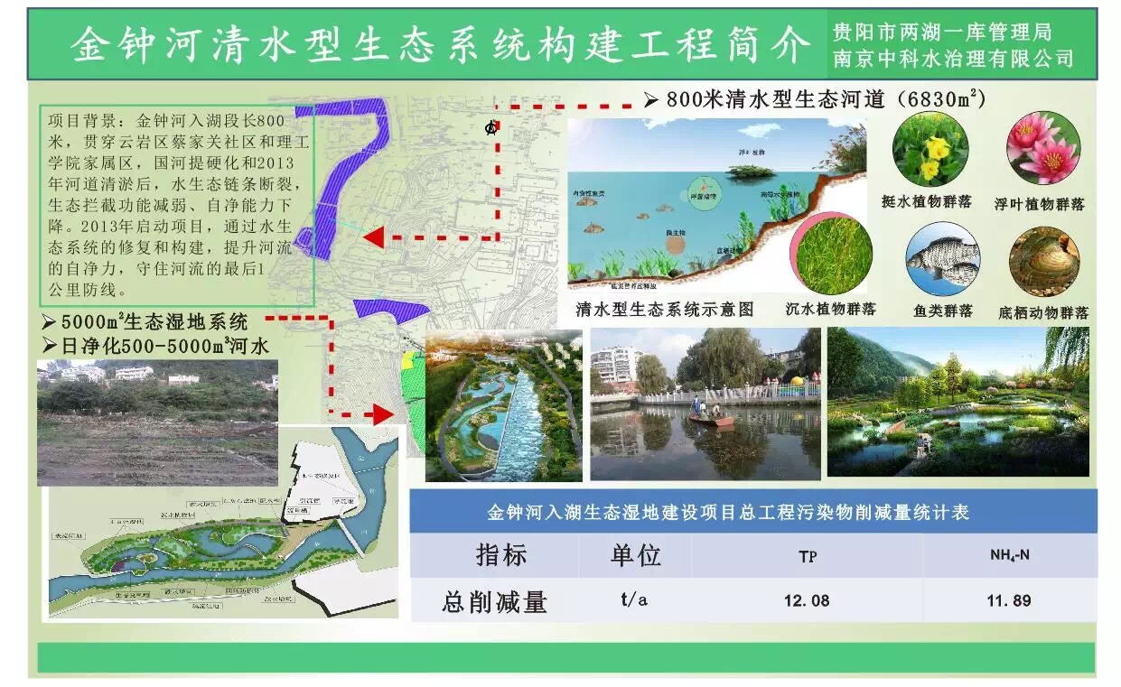 隨著經濟社會的快速發展、城市人口的迅速增長,城市污水處理設施、收集管網建設嚴重滯后,黑臭河道問題長時間無法解決。今年年初,貴州省政府印發《貴州省水污染防治行動計劃工作方案》:明確到2017年,貴陽市建成區基本消除黑臭水體。在此背景下,貴陽市兩湖一庫管理局對阿哈水庫流域進行綜合整治。阿哈水庫金鐘河入湖段生態治理項目是阿哈水庫流域進行綜合整治的項目之一,為防治環境污染,充分發揮和強化河流自身的凈化能力,同時兼顧景觀設計,采用我公司清水型生態系統構建技術對金鐘河流域水體污染進行防治。