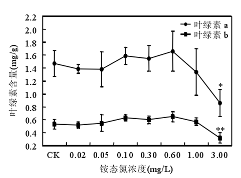 銨態(tài)氮濃度低于 0.60mg/時苦草生長良好,濃度大于或等于 1.00mg/L 時苦草的光合能力受到抑制、代謝受到干擾。苦草對銨態(tài)氮最敏感的生理生化指標是葉片中游離氨基酸態(tài)氮含量。銨態(tài)氮作為沉水植物的一種營養(yǎng)物質,當其含量較低時,植物由于營養(yǎng)缺乏誘導產生自由基。