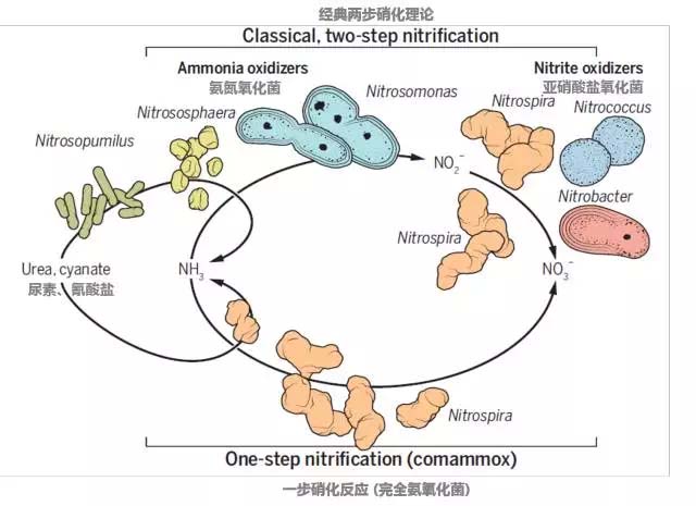 這個理論最先是由俄國微生物界傳奇維諾格拉斯基 (Sergei Winogradsky)早在19世紀末成功展示,他分離出了負責這兩步硝化的微生物,也就是所謂的AOB(ammonia oxidizing bacteria)NOB(nitrite oxidizing bacteria)。但這個超過100年歷史的教條在2015年圣誕節(jié)前被英國明星科學雜志《自然》上的兩篇同日發(fā)表的題目雷同的文章和隨后一篇在美國微生物學會的文章終結了。三個科學團隊發(fā)現(xiàn)了三種不同的培養(yǎng)[1,2]和一種非培養(yǎng)細菌[3]能夠各自進行從氨氮到硝態(tài)氮的完全硝化過程。