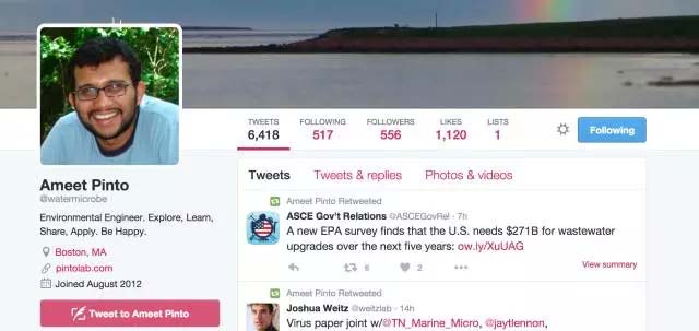 如果你的研究方向和他相似,盡可以跟他聯(lián)系,他的推特賬號是@watermicrobeemail a.pinto@neu.edu
