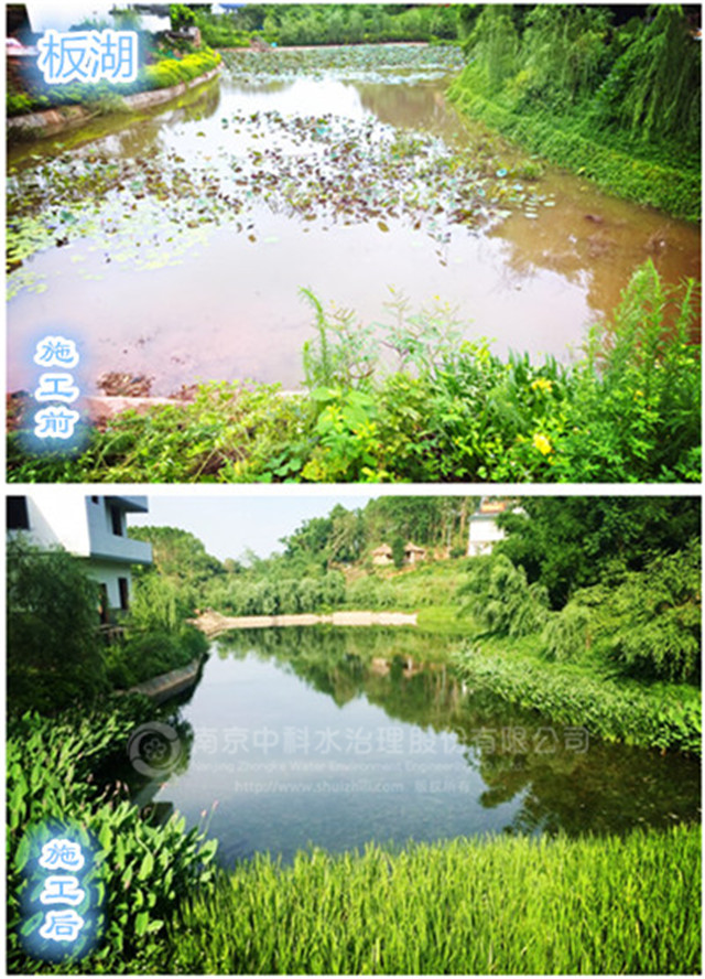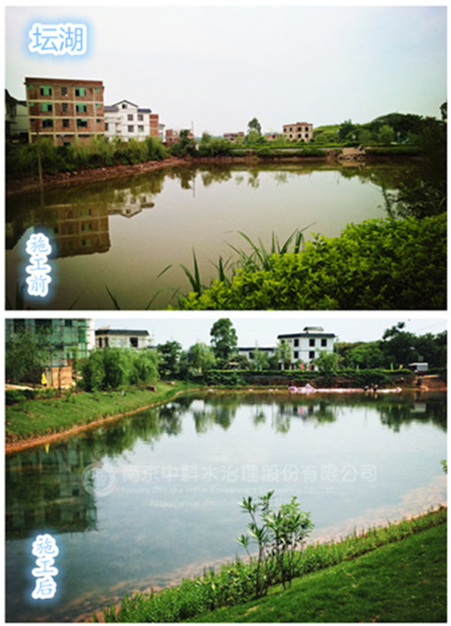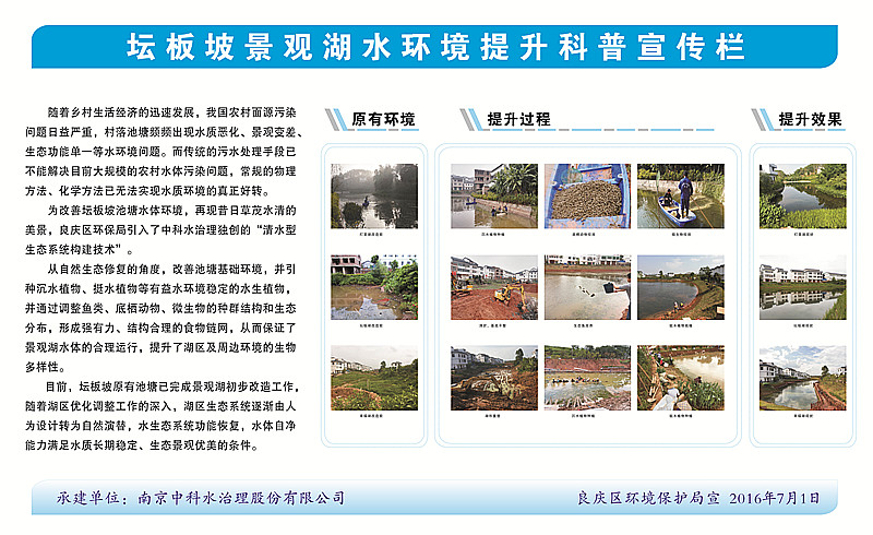 2015年12月12日,中科水治理參與的壇板坡景觀湖水生態構建工程正式開工,景觀湖位于中心街區的東部,分為壇湖和板湖兩個獨立的水體,是典型的農村污染型水體。水體總面積約15畝,平均水深1.5米,采用中科水治理獨創的“清水型生態系統構建技術”,主要建設內容包括基底改良、湖形重塑、微生物菌種投放、沉水植物群落構建、挺水、浮葉植物群落構建、魚類放養、大型底棲動物投放等。2016年3月30日,項目順利通過驗收。